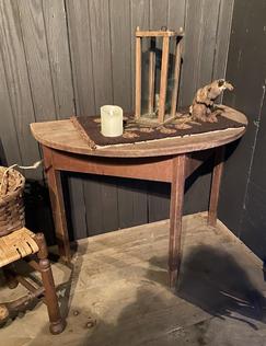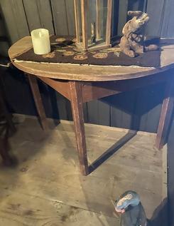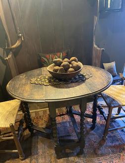 Sweetest oval table. It’s a drop leaf but very early one. Great legs of burley twists. Makes into a very small table when leaves are down. 27-1/2 height by 18 wide and 18 deep. Great look in front of settle or couch $790