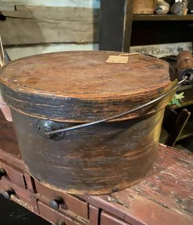 Red bail handled pantry box. Strong paint. Thick walls 9 -1/2 across and5-1/2 tall $475
