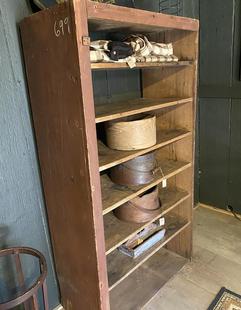 Early red shelf unit. Old red. There’s a hinge on upper left side to make one believe there was a door at one time. I’ve had this in my house for years and holds a great many things. 66 high by 36 wide and 16 deep. Would look great in a bedroom or use for buttry shelves $699